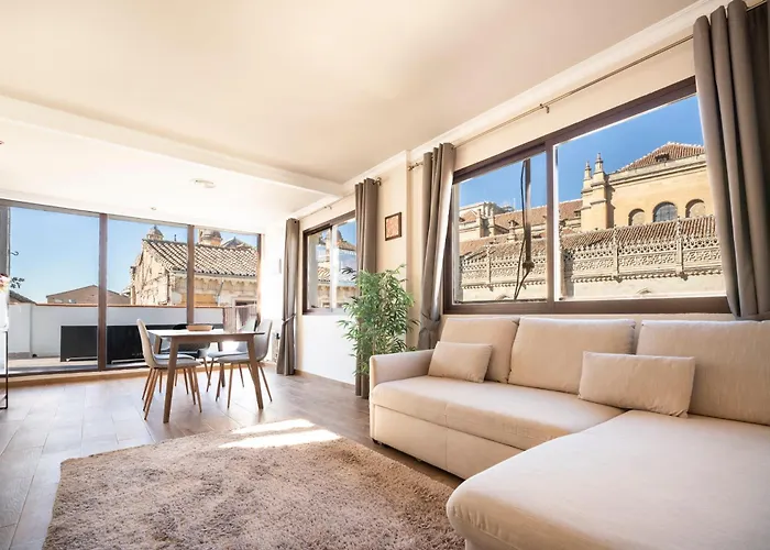 Die 1-Zimmer-Ferienwohnung Atico Con Terraza Y Vistas Unicas A La Catedral Pleno Centro De Granada empfängt Reisende im Zentrum von Granada, in 1 km Entfernung von AWAY dem Palast Karl V. entfernt. Diese 54 m² großen Apartments verfügt über eine Terrasse mit Blick auf die Stadt.